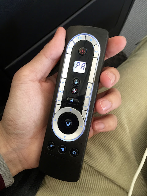 左手邊的扶手也有遙控器(左邊好忙),靈敏度還不錯,是線控,快速拉一下就會收回去的那種;按鈴請空服員過來的時候他們的速度很快。